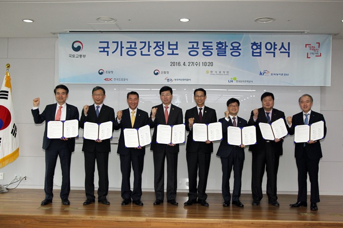 (세종=포커스뉴스) 최정호 국토교통부 2차관이 27일 오전 세종시 정부세종청사 국토부 대회의실에서 범부처간 국가공간정보의 안정적 제공 및 공동 활용을 위한 업무협약을 체결하고 기념촬영을 하고 있다. <사진제공=국토교통부>