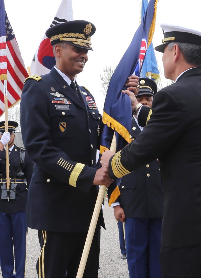 (서울=포커스뉴스) 빈센트 브룩스 신임 한·미연합사령관 겸 주한미군사령관이 30일 서울 용산기지 나이트필드에서 열린 이취임식에서 주한미군기를 전달 받고 있다. <사진제공=주한미군 홈페이지>