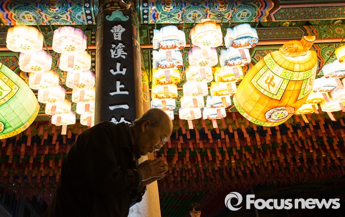 (서울=포커스뉴스) 부처님오신날을 앞두고 26일 밤 서울 종로구 견지동 조계사 정문 앞에 다양한 형태의 연등들이 불을 밝히고 있는 가운데 한 불자가 가족들의 무사 안녕을 기원하고 있다.