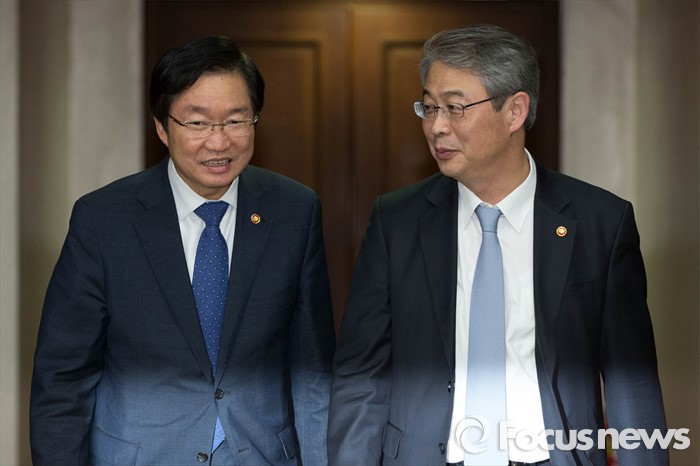 (서울=포커스뉴스) 28일 오후 서울 종로구 정부서울청사에서 김영석(왼쪽) 해양수산부 장관과 임종룡 금융위원장이 '경제관계장관회의'가 참석하고 있다.