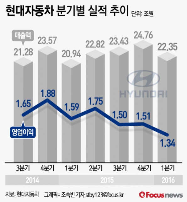 (서울=포커스뉴스) 26일 현대자동차는 올해 1분기 영업이익은 1조3424억원, 매출액은 22조3506억원으로 각각 전년 동기 대비 15.5% 감소, 6.7%늘어난 수치라고 밝혔다.