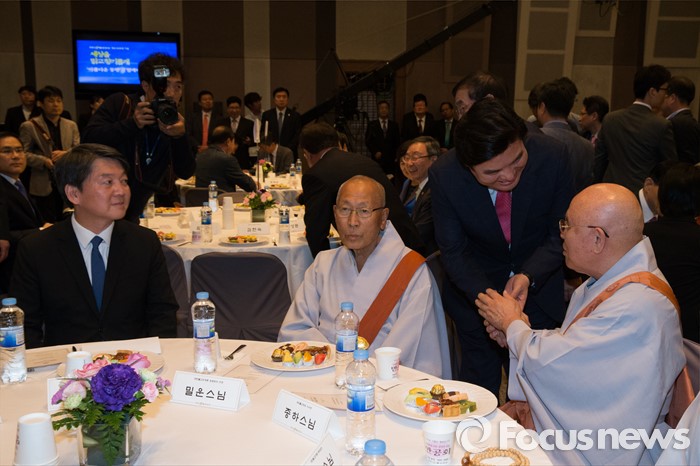 (서울=포커스뉴스) 2일 오후 서울 중구 프레스센터에서 열린 BBS 불교방송 개국 26주년 기념 비전선포식에 참석한 원유철(오른쪽) 새누리당 원내대표가 스님과 인사를 나누고 있다.