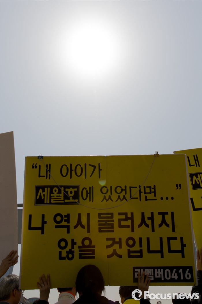 (서울=포커스뉴스) 25일 오전 서울 여의도 국회의사당 정문 앞에서 4월 16일의 약속국민연대 관계자들이 세월호 진상규명 특별법 개정 및 특검 실시 촉구 기자회견을 하고 있다.