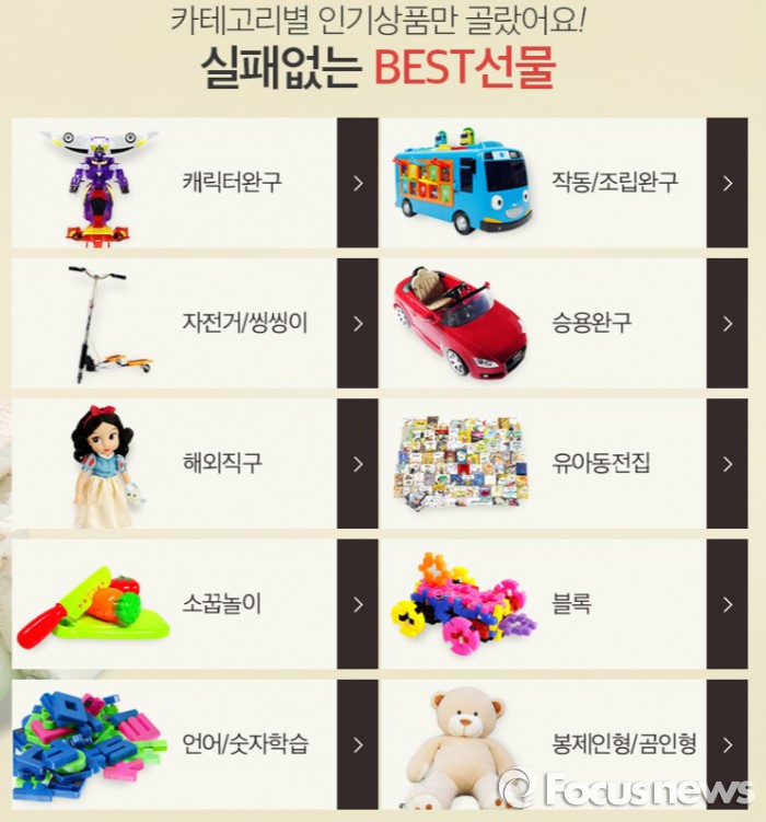 김정환 출산유아동팀 MD는 이번 어린이날 선물로 △6개월~4세 이하 유아는 멀티 교육 완구인 브랜드 B제니쥬의 원목롤러코스터(7만9800원)△5~8세 남아는 전동차 BMW 4 쿠페(16만9000원), 여아는 세라의 공주폰(4만4800원)△초등학생 이상의 남녀 아이들에게는 발광바퀴 어린이 킥보드(4만7600원), 닌텐도 3DSXL(20만4590원)등을 추천했다.