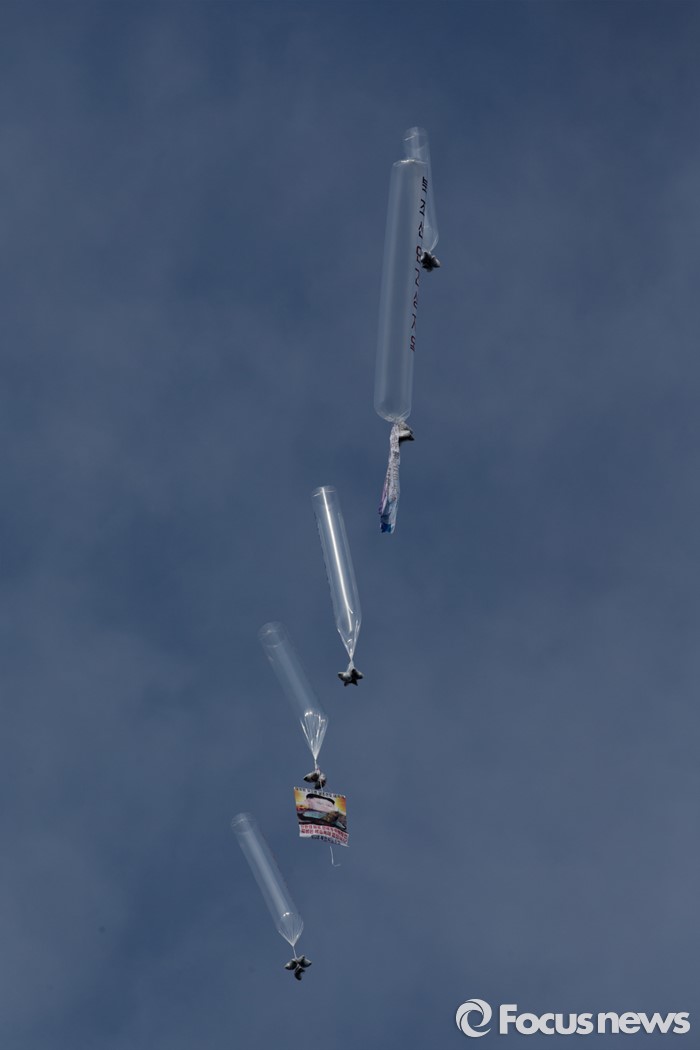 (파주=포커스뉴스) 29일 오후 경기 파주 낙하IC 인근에서 탈북자단체인 자유북한운동연합이 북한에 핵과 미사일을 포기하고 국제사회 일원으로 참여할 것을 촉구하는 내용의 대북전단을 날려보내고 있다.