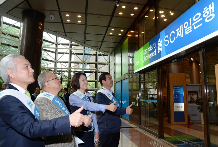 SC제일은행은 지난 6일 브랜드명을 기존의 한국SC은행에서 SC제일은행으로 변경했다. 이번 본점 간판 교체를 시작으로 다른 영업점의 간판, 홍보물, 온라인 콘텐츠, 기타 물품에 대해 고객이 불편을 느끼지 않도록 시간을 두고 순차적으로 브랜드 변경작업을 진행할 예정이다.박종복(사진 왼쪽) SC제일은행장이 28일 서울 종로구 본점에서 영업부 간판을 'SC제일은행'으로 바꾸는 제막식 행사에 참여했다.<사진제공=SC제일은행>