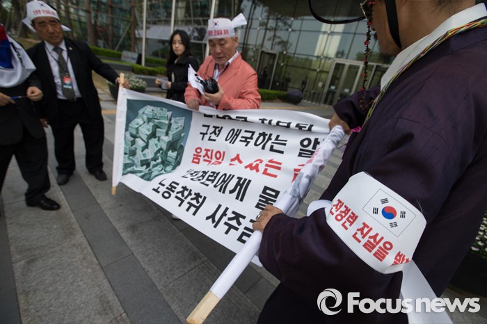 (서울=포커스뉴스) 26일 오후 서울 영등포구 전경련회관 앞에서 애국국민운동대연합 회원들이 어버이연합 억대 금품지원 규탄 기자회견 열고 퍼포먼스를 하고 있다.