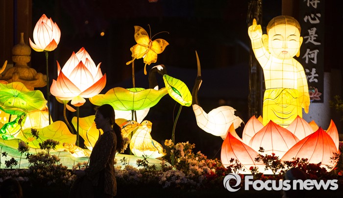 (서울=포커스뉴스) 부처님오신날을 앞두고 26일 밤 서울 종로구 견지동 조계사 정문 앞에 다양한 형태의 연등들이 불을 밝히고 있는 가운데 길을 지나던 시민들이 연등 앞에서 기념사진을 찍고 있다.