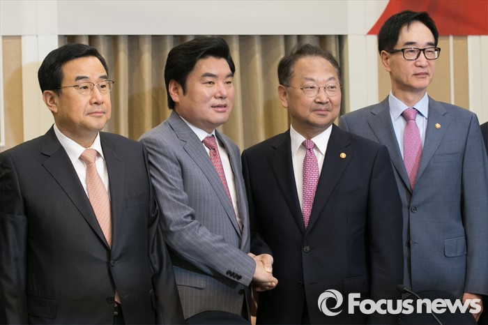 이날 당정협의에는 새누리당 원유철 원내대표·김정훈 정책위의장·김광림 의원이, 정부 측 유일호 경제부총리 겸 기획재정부 장관, 이준식 사회부총리 겸 교육부 장관, 이기권 고용노동부 장관, 최양희 미래창조부 장관, 강은희 여성가족부 장관 등이 참석했다.27일 오전 서울 여의도 국회 귀빈식당에서 열린 청년 · 여성 일자리대책 당정협의 참석자들이 기념사진을 찍고 있다. 왼쪽부터 김정훈 새누리당 정책위의장, 원유철 새누리당 대표최고위원 권한대행, 유일호 경제부총리, 이준식 사회부총리. 2016.04.27 박철중 기자