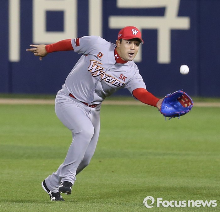 (서울=포커스뉴스) 27일 서울 잠실구장에서 열린 2016 프로야구 SK-두산 경기 7회말 2사후 SK 우익수 정의윤이 두산 김재호의 타구를 달려 나오면서 잡고 있다.