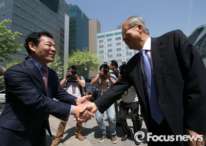 (광주=포커스뉴스) 김종인(오른쪽) 더불어민주당 비대위 대표와 윤장현 광주시장이 25일 오후 광주의 한 음식점에서 오찬 간담회에 앞서 인사하고 있다.