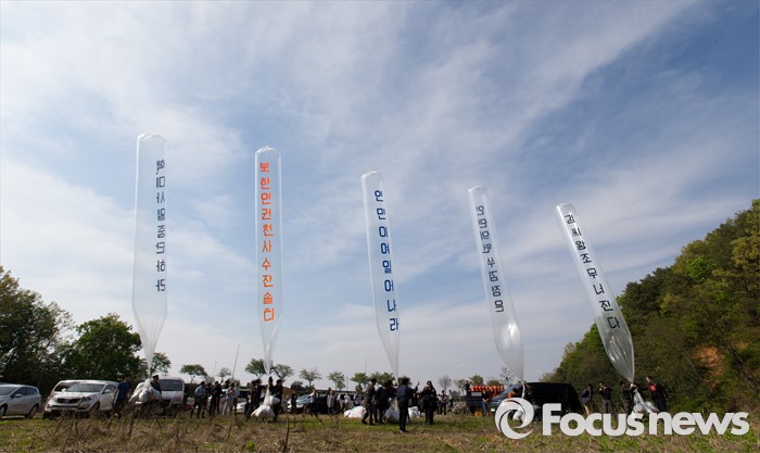 (파주=포커스뉴스) 29일 오후 경기 파주 낙하IC 인근에서 탈북자단체인 자유북한운동연합이 북한에 핵과 미사일을 포기하고 국제사회 일원으로 참여할 것을 촉구하는 내용의 대북전단을 날려보내고 있다.