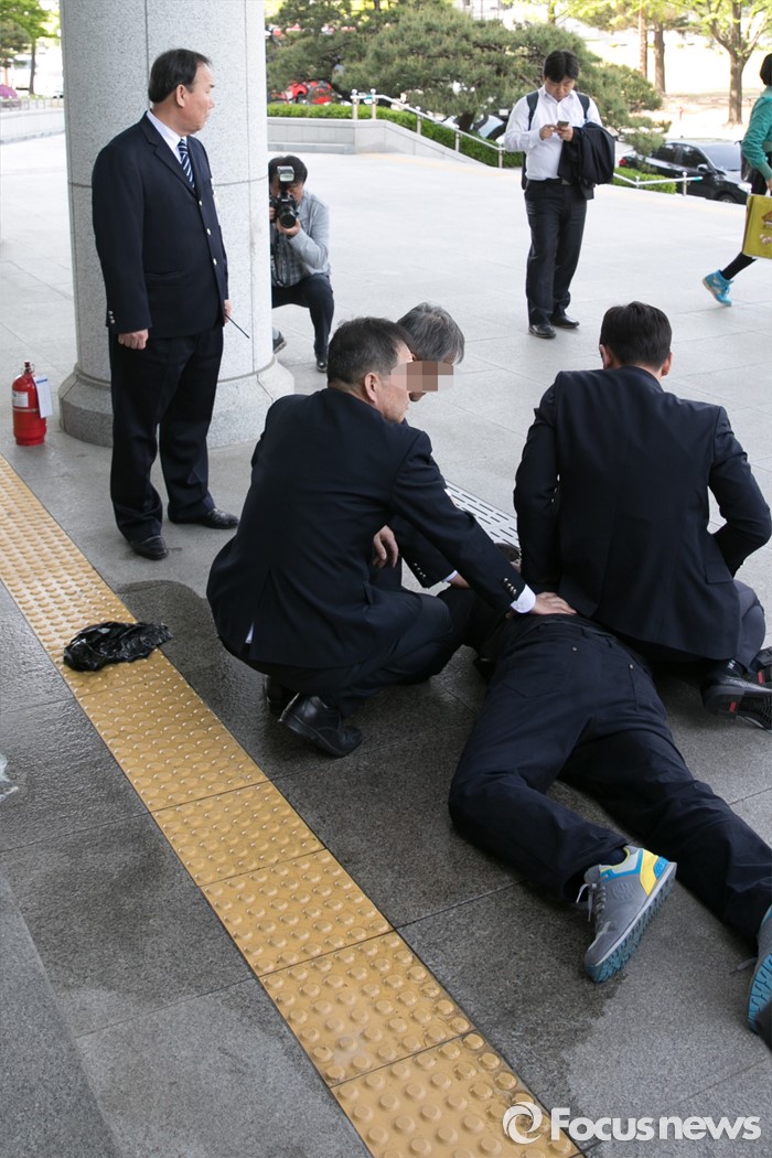 (서울=포커스뉴스) 25일 오후 서울 여의도 국회 의원회관 앞에서 신원 미상의 한 중년 남성이 분신 시도를 하려다, 국회 방호원들에게 제압당하고 있다.