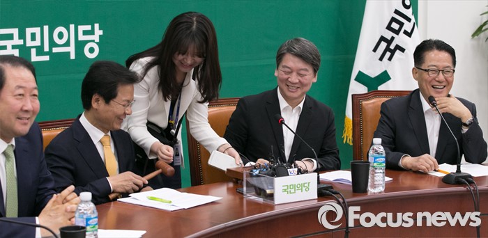 (서울=포커스뉴스) 2일 오전 서울 여의도 국회에서 열린 국민의당 최고위원회의에 참석한 지도부가 당직자들을 통해 회의 진행을 위한 의사봉을 찾던 중 가까운 위치에서 의사봉을 발견하자 웃고 있다. 왼쪽부터 박주선 최고위원, 천정배 공동대표, 안철수 상임공동대표, 박지원 원내대표.