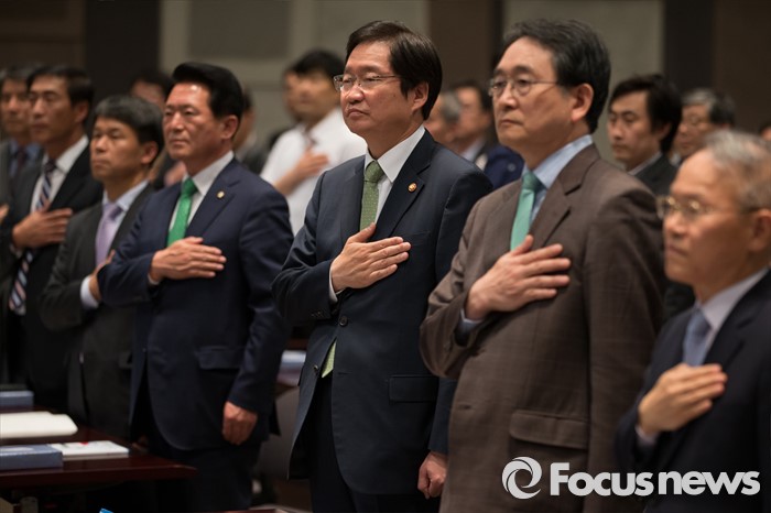 (서울=포커스뉴스) 김영석(오른쪽 세번째) 해양수산부 장관이 27일 오후 서울 중구 한국프레스센터에서 열린 2016 해양플랜트 서비스산업 발전전략 세미나 개회식에 참석해 국기에 대한 경례를 하고 있다.
