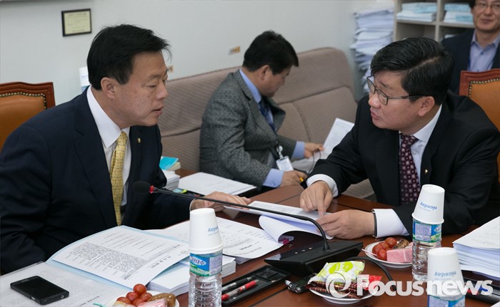 (서울=포커스뉴스) 26일 오전 서울 여의도 국회에서 열린 법제사법위원회 법안심사1소위원회에 참석한 이한성(왼쪽) 소위원장과 전해철 야당 간사가 대화하고 있다.