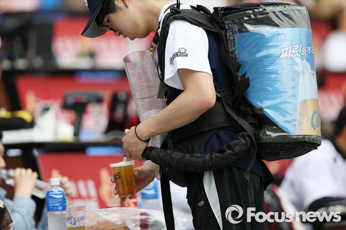 (서울=포커스뉴스) 더운 여름 날씨같은 5월 첫 날, 잠실구장에서 낮 경기로 열린 2016 프로야구 kt-LG 전. 최근 국세청이 야구장에서 맥주의 이동판매를 허용한뒤 맥주보이가 관중석을 돌아다니며 시원한 맥주를 관중들에게 판매하고 있다.