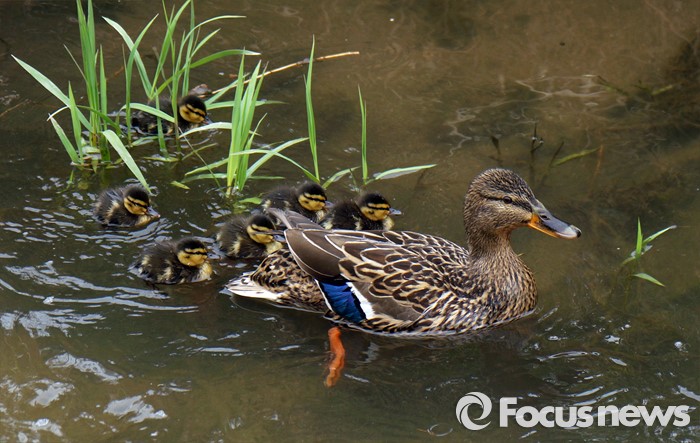 (과천=포커스뉴스) 27일 경기도 과천 양재천에 청둥오리가 갓 부화한 새끼들을 데리고 봄나들이 나왔다. 새끼들은 삐약 삐약 지저귀며 어미 뒤를 따른다.