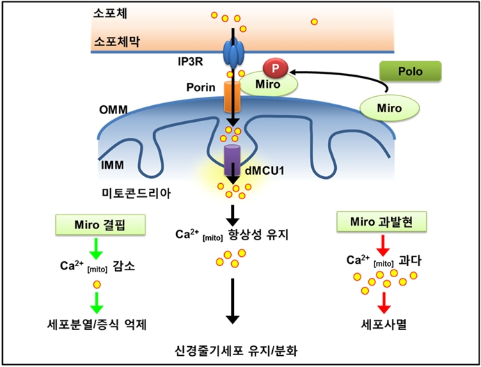 연구팀은 미토콘드리아에 존재하는 Miro 단백질이 Polo kinase 효소(대표적 인산화 효소)에 의해 인산화 돼 미토콘드리아를 소포체로 이동시켜 칼슘 흡수를 촉진한다는 것을 발견했다. 또한 미토콘드리아 칼슘 농도에 따라서 신경줄기세포의 자가재생산 활성을 조절하는 것을 알아냈다.