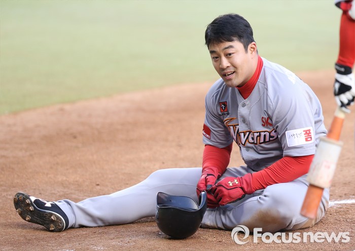 (서울=포커스뉴스) 28일 서울 잠실구장에서 열린 2016 프로야구 SK-두산 경기 1회초 2사 1루에서 SK 이재원의 우측 펜스를 맞추는 안타때 1루주자 정의윤이 홈에서 아웃된후 지쳐서 주저앉아 있다.