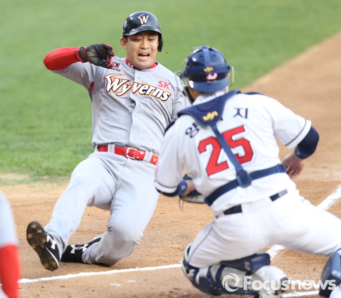 (서울=포커스뉴스) 28일 서울 잠실구장에서 열린 2016 프로야구 SK-두산 경기 1회초 2사 1루에서 SK 이재원의 우측 펜스를 맞추는 안타때 1루주자 정의윤이 홈까지 달려들다 아웃되고 있다.