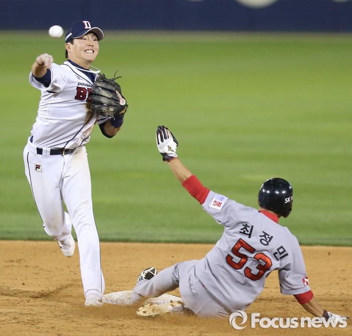 (서울=포커스뉴스) 26일 서울 잠실구장에서 열린 2016 프로야구 SK-두산 경기 8회초 무사 1루에서 SK 조동화의 유격수앞 땅볼때 두산 2루수 류지혁이 SK 1루주자 최정민을 포스아웃시키고 1루로 송구하고 있다.