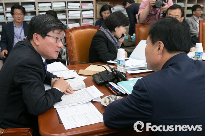 (서울=포커스뉴스) 전해철(왼쪽) 위원장이 27일 오전 서울 여의도 국회에서 법제사법위원회 법안심사제2소위원회 개회 전, 이한성(오른쪽) 여당 간사와 대화하고 있다.