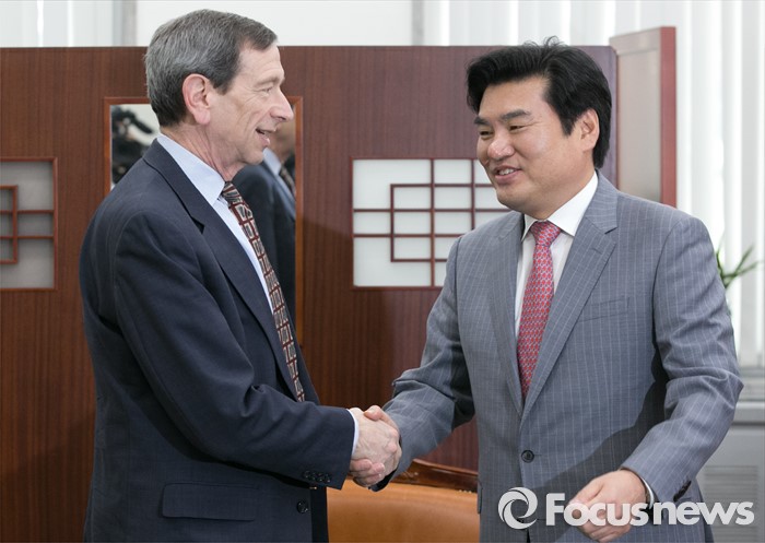 (서울=포커스뉴스) 원유철(오른쪽) 새누리당 원내대표가 27일 오후 서울 여의도 국회를 방문한 로버트 아인혼 전 미국 국무부 차관보와 면담에 앞서 악수하고 있다.