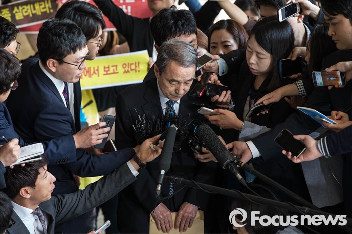 (서울=포커스뉴스) 가습기 살균제 과실 책임을 받고 있는 신현우 전 옥시 대표가 피의자 신분으로 26일 오전 서울 서초구 서울중앙지방검찰청에 출두하고 있다.