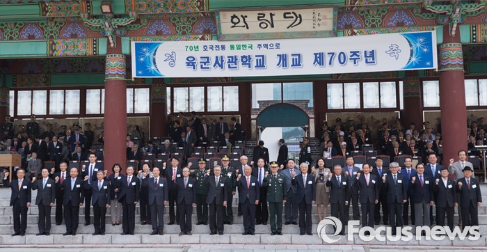(서울=포커스뉴스) 29일 오후 서울 노원구 육군사관학교에서 열린 개교 70주년 기념식에서 최병로 육군사관학교장을 비롯한 내빈들이 기념촬영 하고 있다.