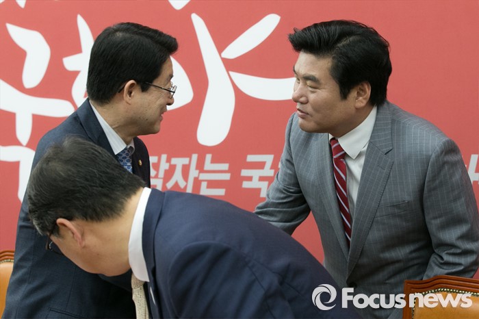 (서울=포커스뉴스) 원유철(오른쪽) 새누리당 원내대표와 정희수 기재위원장이 25일 오전 서울 여의도 국회에서 열린 상임위원장 · 간사단 연석회의에 참석해 악수하고 있다.