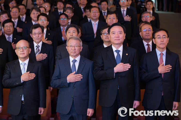(서울=포커스뉴스) 25일 오전 서울 서초구 대검찰청에서 열린 제53회 법의날 기념식에서 참석자들이 국민의례를 하고 있다. 앞줄 왼쪽부터 박한철 헌법재판소장, 양승태 대법원장, 김현웅 법무부장관, 김수남 검찰총장.