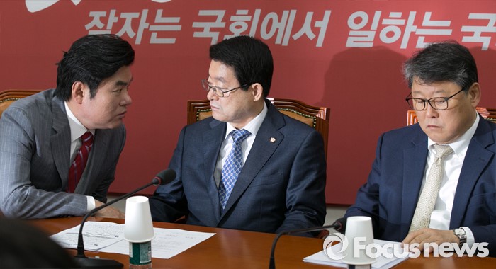(서울=포커스뉴스) 원유철(왼쪽) 새누리당 원내대표와 정희수(가운데) 기재위원장이 25일 오전 서울 여의도 국회에서 열린 상임위원장 · 간사단 연석회의에 참석해, 대화하는 동안, 조원진 원내수석부대표가 자료를 보고 있다.