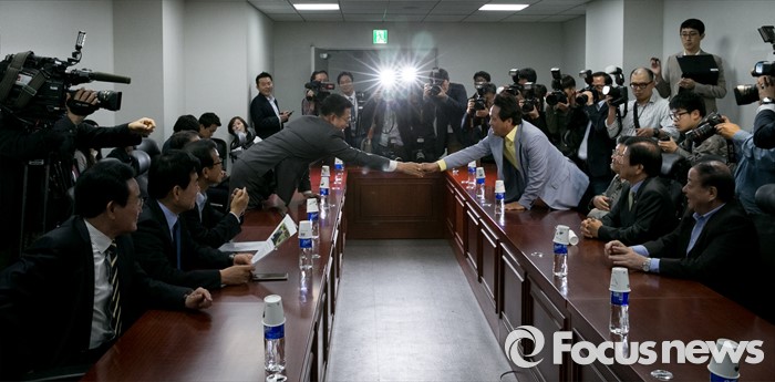 (서울=포커스뉴스) 29일 오전 서울 여의도 국회 의원회관에서 전당대회 연기론 등 논의를 위해 진행된 더불어민주당 4선 이상 중진모임에 참석한 송영길(왼쪽) 당선인과 안민석 의원이 인사하고 있다. 이날 모임에는 강창일, 변재일, 이상민, 안민석, 설훈, 박병석, 오제세, 이상민, 문희상 의원과 김진표, 송영길 당선인 등이 참석했다.
