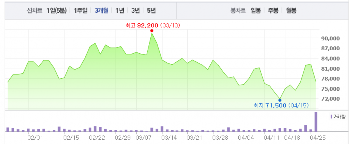 26일 11시49분 현재 로엔 주가는 전일대비 6.4%(5300원) 하락해 7만7000원을 기록 중이다.