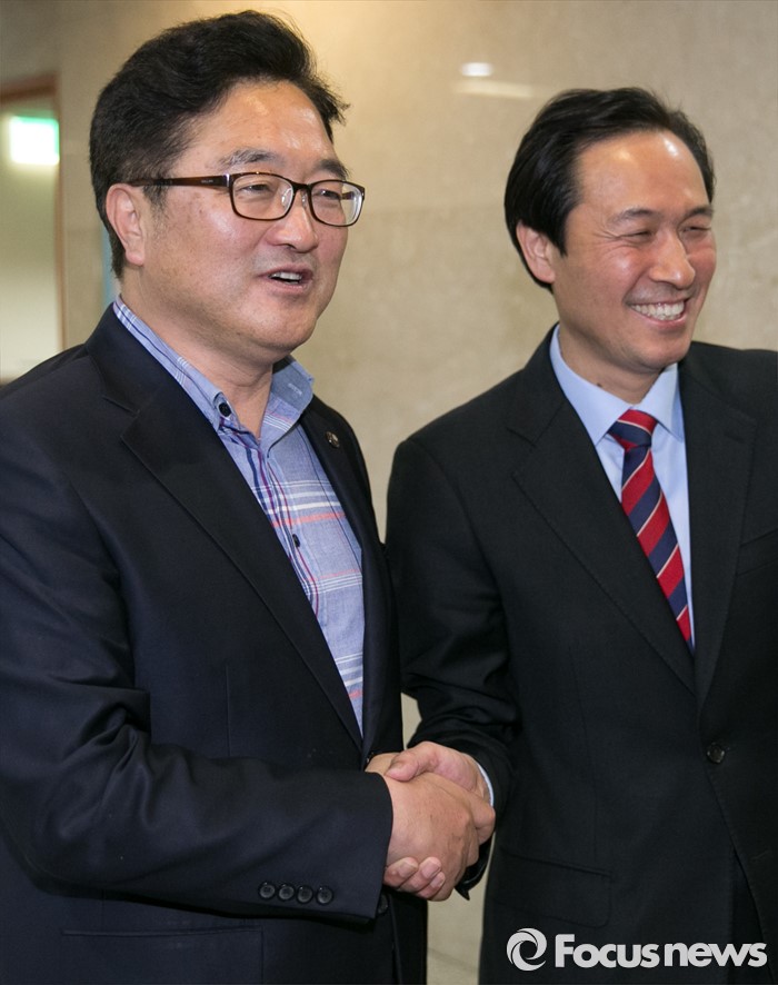 (서울=포커스뉴스) 원내대표 경선에 출마하는 우상호(오른쪽), 우원식 더불어민주당 의원이 29일 오후 서울 여의도 국회 정론관 앞에서 만나 취재진을 향해 포즈를 취하고 있다.