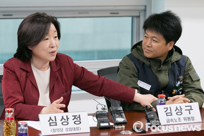 (서울=포커스뉴스) 심상정(왼쪽) 정의당 대표가 27일 오후 서울 여의도 국회 의원회관에서 조선업종 구조조정 긴급현안 간담회에 참석해, 김상구 민주노총 금속노조 위원장과 대화하고 있다.