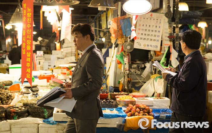 (서울=포커스뉴스) 27일 오전 서울 동작구 노량진 수산시장에서 법원 공무원들이 점유이전금지 가처분 집행을 위해 관련 점포를 확인하고 있다.