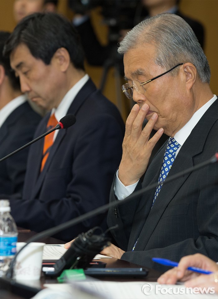 대전=포커스뉴스) 김종인 더불어민주당 비대위 대표와 이종걸 원내대표를 비롯한 더민주 의원 및 당직자들이 28일 오후 대전시청을 방문한 가운데 대회의실에서 열린 더불어민주당-대전시 정책간담회에서 김종인 대표가 얼굴을 만지며 잠시 생각에 잠긴 모습을 보이고 있다.