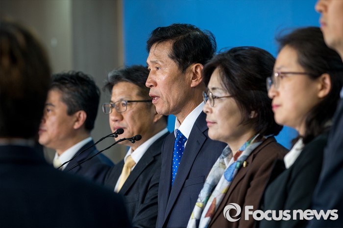 (서울=포커스뉴스) 이학영(오른쪽 네번째) 더불어민주당 의원이 2일 오전 서울 여의도 국회에서 테러방지법 시행 관련 기자회견을 하고 있다.