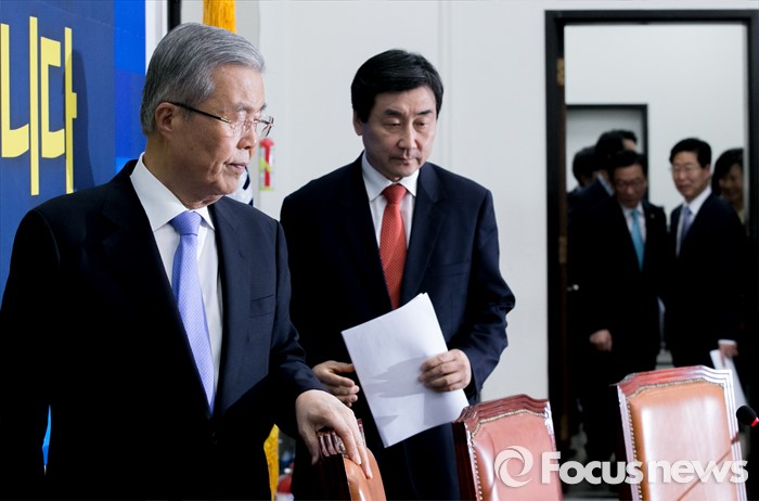 (서울=포커스뉴스) 김종인(왼쪽) 더불어민주당 비대위 대표와 이종걸 원내대표가 29일 오전 서울 여의도 국회에서 열린 비상대책위원회의에 참석하고 있다.