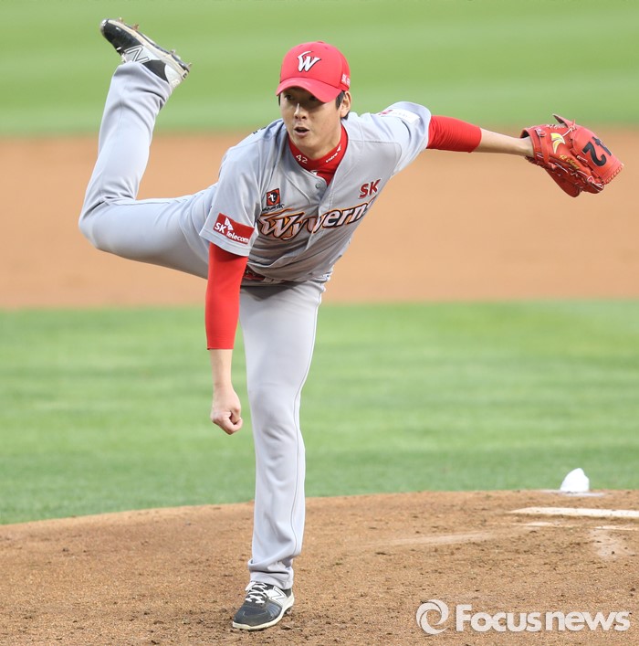 (서울=포커스뉴스) 28일 서울 잠실구장에서 열린 2016 프로야구 SK-두산 경기에서 1회말 SK 선발투수 문승원이 투구하고 있다.