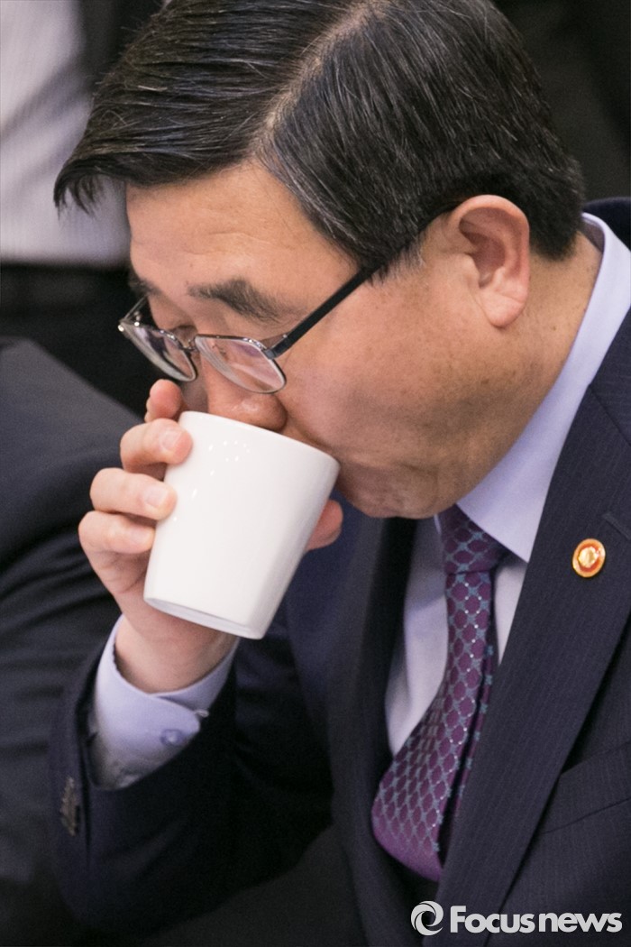 (서울=포커스뉴스) 이기권 고용노동부 장관이 27일 오전 서울 여의도 국회 귀빈식당에서 열린 청년 · 여성 일자리대책 당정협의에 참석해, 물을 마시고 있다.