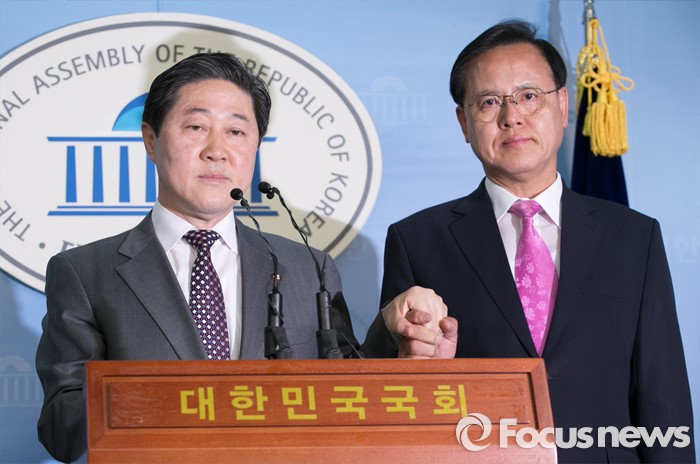 (서울=포커스뉴스) 유기준(왼쪽) 새누리당 의원이 28일 오후 서울 여의도 국회 정론관에서 원내대표 출마 기자회견을 하며 정책위의장 러닝메이트 후보인 이명수 의원과 손을 잡고 있다.