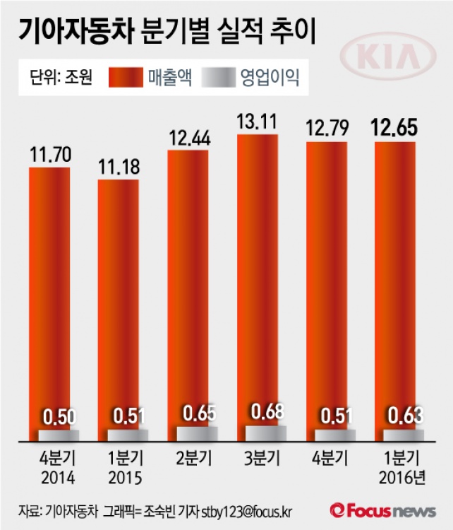 (서울=포커스뉴스) 기아자동차는 27일 공시를 통해 2016년 1분기 매출액이 전년 동기 대비 13.2% 증가한 12조6494억원을 기록했다고 밝혔다.