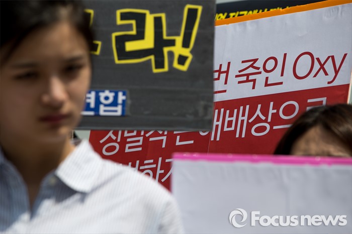 (서울=포커스뉴스) 25일 오전 서울 종로구 광화문 광장에서 옥시 가습기 살균제 피해 가족 및 환경단체 관계자들이 옥시 상품 불매를 촉구하는 기자회견을 하고 있다.