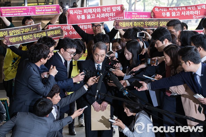 | △ 취재진 질문 받는 신현우 전 옥시 대표 |