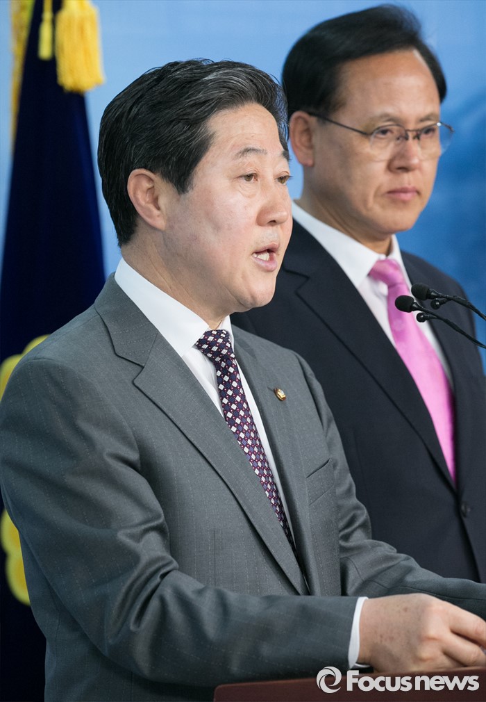 (서울=포커스뉴스) 유기준(왼쪽) 새누리당 의원이 28일 오후 서울 여의도 국회 정론관에서 정책위의장 러닝메이트 후보인 이명수 의원과 원내대표 출마 기자회견을 하고 있다.