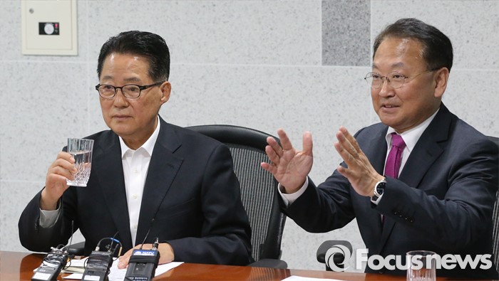 (서울=포커스뉴스) 박지원(왼쪽) 국민의당 원내대표가 29일 오전 서울 여의도 국회 의원회관에서 경제활성화법안 등 처리 요청을 위해 방문한 유일호 경제부총리 겸 기획재정부 장관과 면담을 하고 있다.
