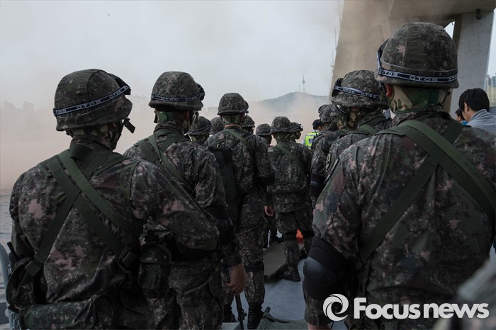 (서울=포커스뉴스) 27일 오전 서울 영등포구 여의도 한강공원 원효대교 일대에서 열린 '수도 서울 민․관․군 합동 대규모 복합재난 가상훈련'에 참가한 군인들이 훈련에 임하고 있다.